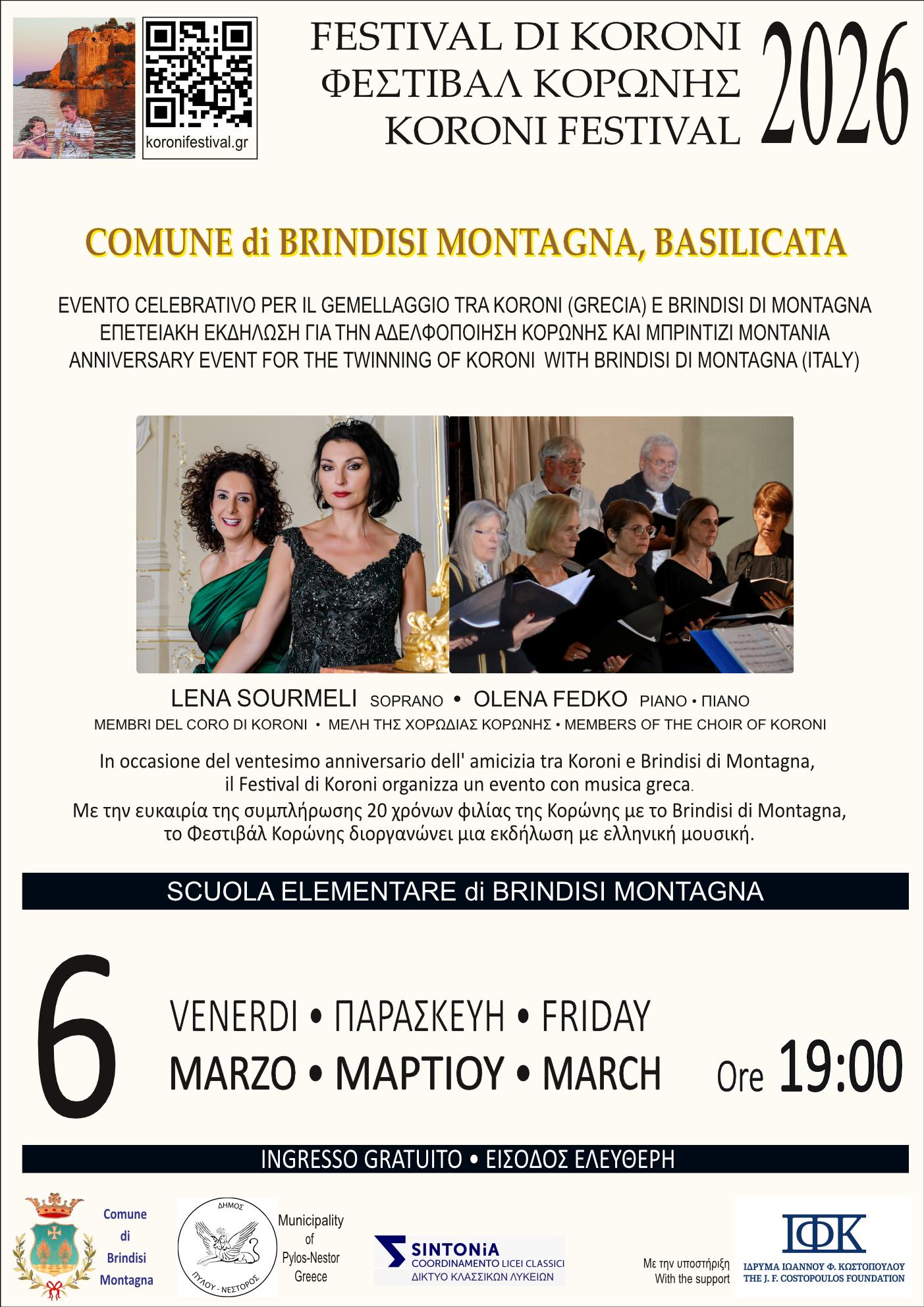 In occasione del ventennale dell’amicizia tra Koroni e Brindisi di Montagna il Festival di Koroni organizza un evento dedicato alla musica greca.